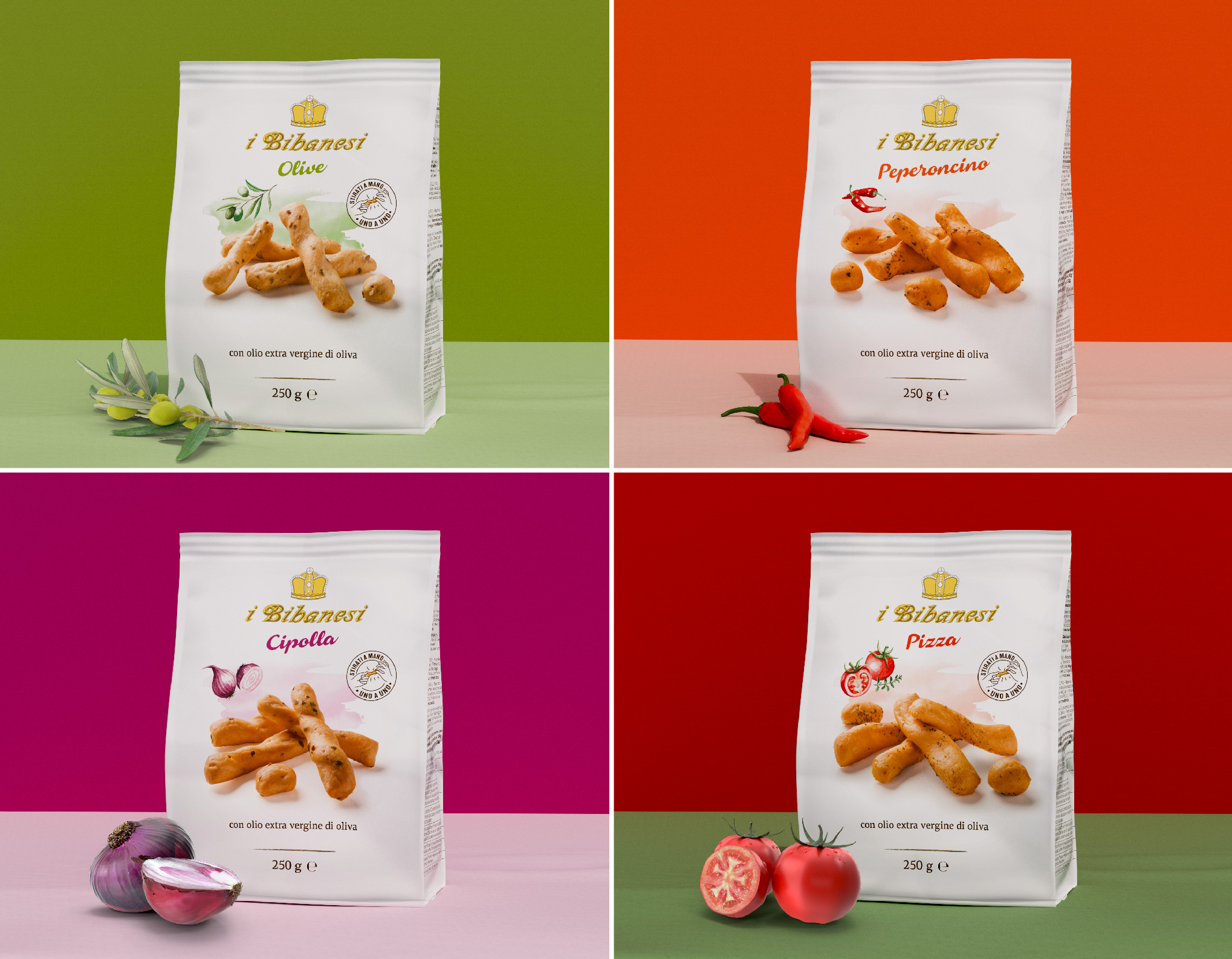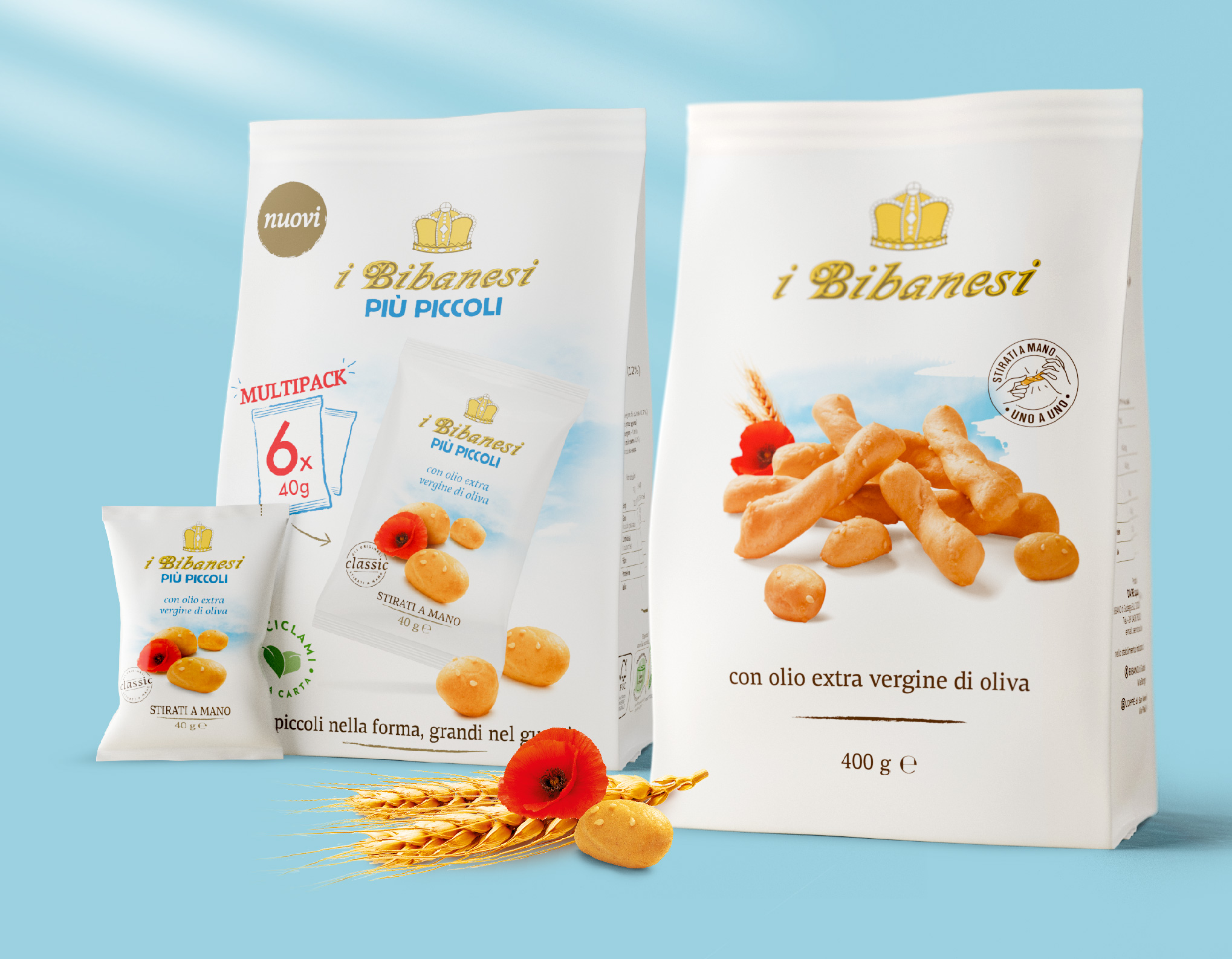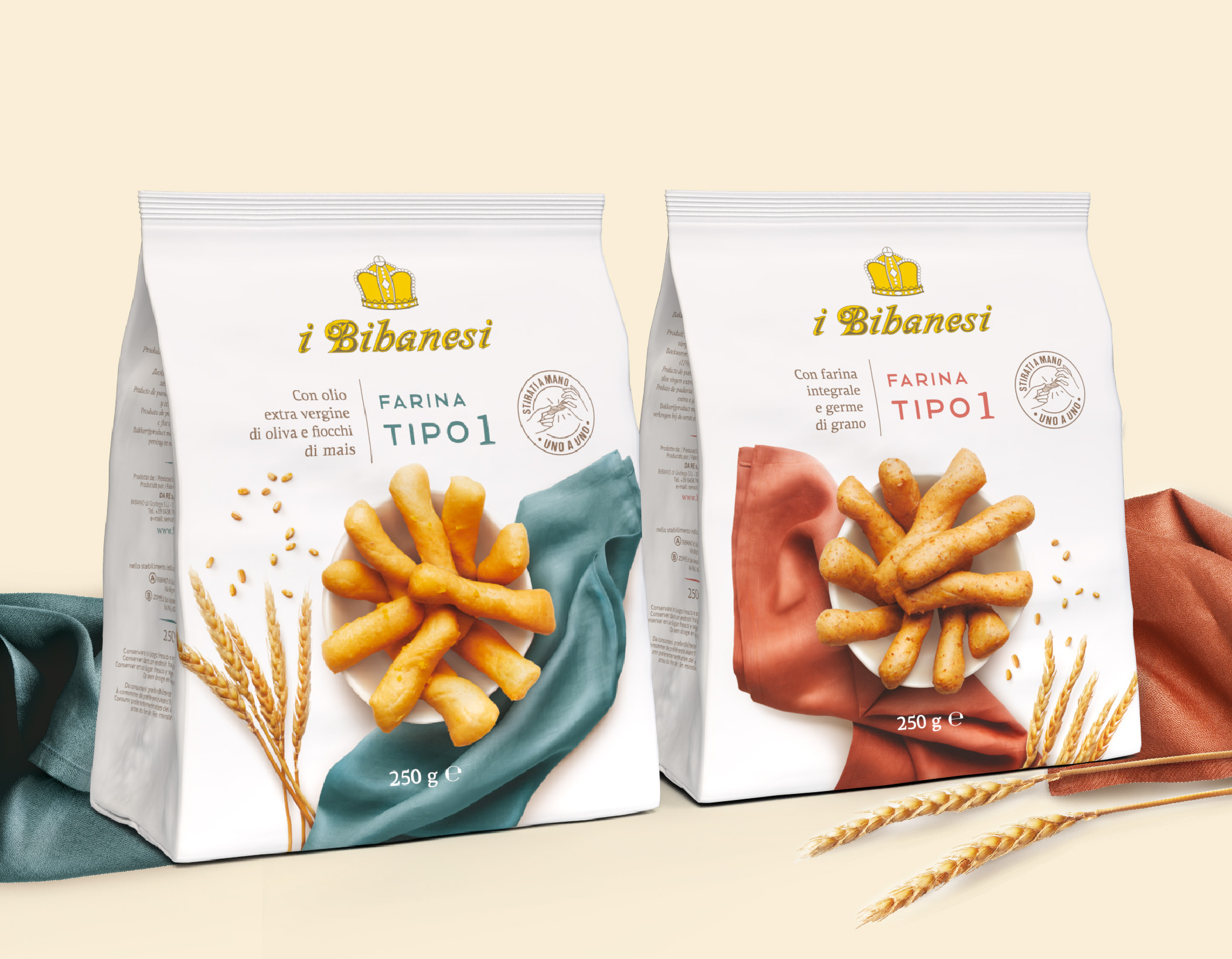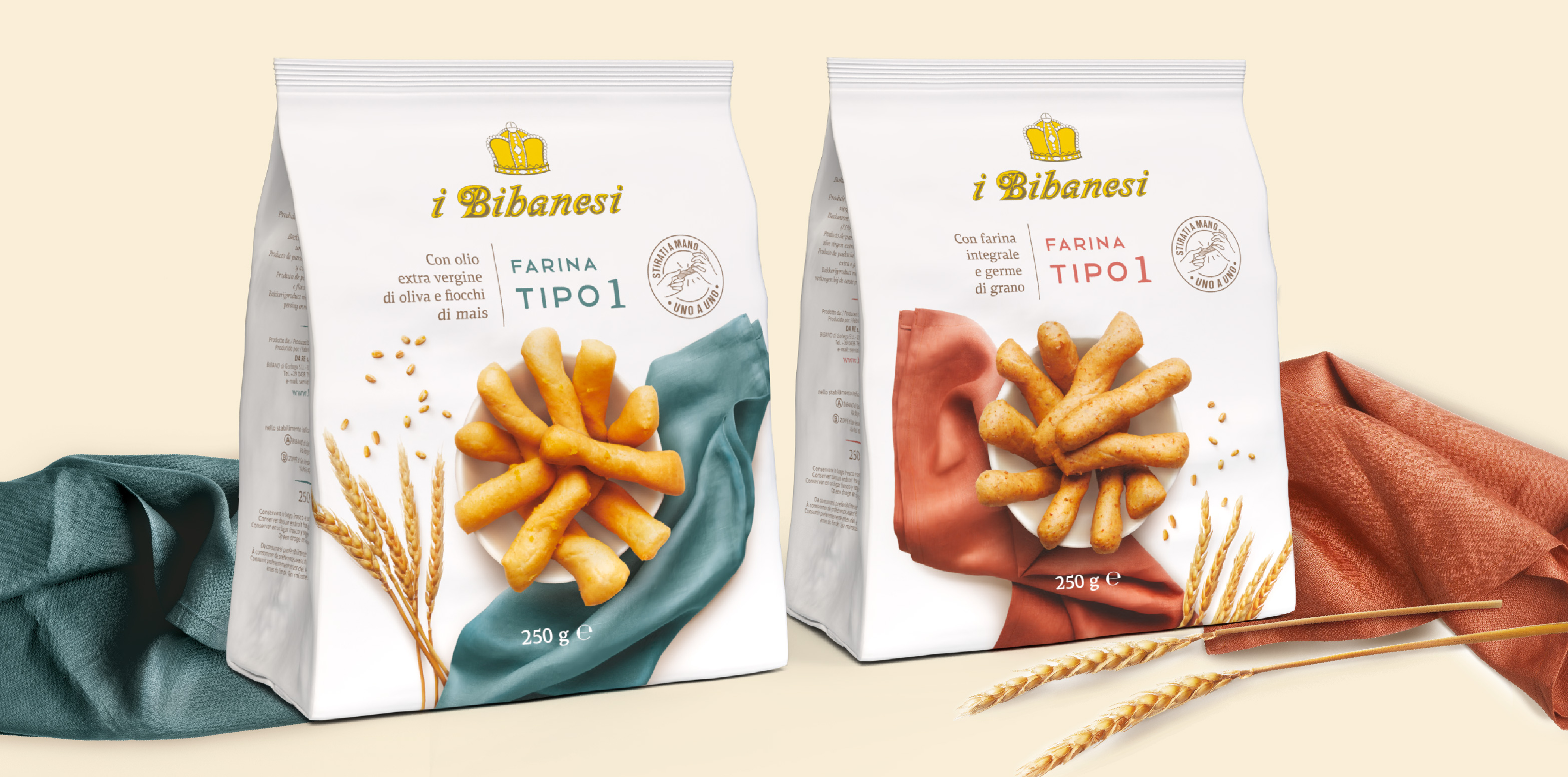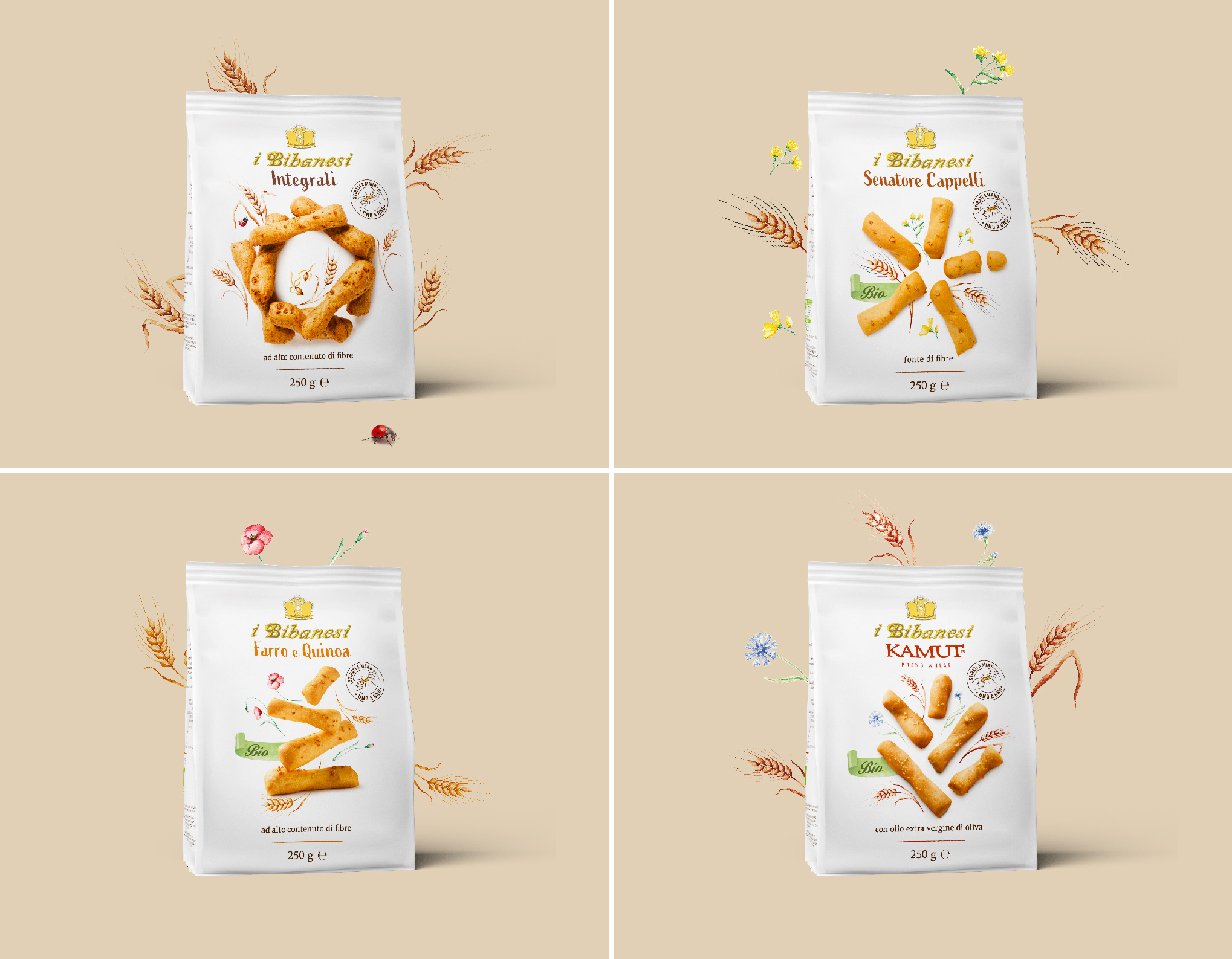 Tutto è iniziato dal packaging, vera icona della marca: una confezione unica e distintiva, caratterizzata dal bianco, con il personale logotipo voluto dal fondatore e l’immagine dei grissini, semplicemente associati alla naturalità del grano sotto l’azzurro cielo d’estate. Attualizzare un racconto così autentico in occasione del lancio di un nuovo prodotto – i Bibanesi più piccoli – è stata la nostra prima sfida, in equilibrio tra rispetto ed entusiasmo, tra slancio in avanti e cura del patrimonio visivo della marca. Sono seguite poi la linea Mediterranea, contraddistinta dagli acquerelli eseguiti a mano (i Bibanesi vivono da sempre una grande storia d’amore con l’arte e l’illustrazione grafica); la linea dei “grani speciali”, che traduce ogni tipo di cereale in una specifica composizione di panetti, sempre circondati da fiori di campo e spighe dipinte; i “Tipo 1”, dall’impasto più rustico, con farina poco raffinata.