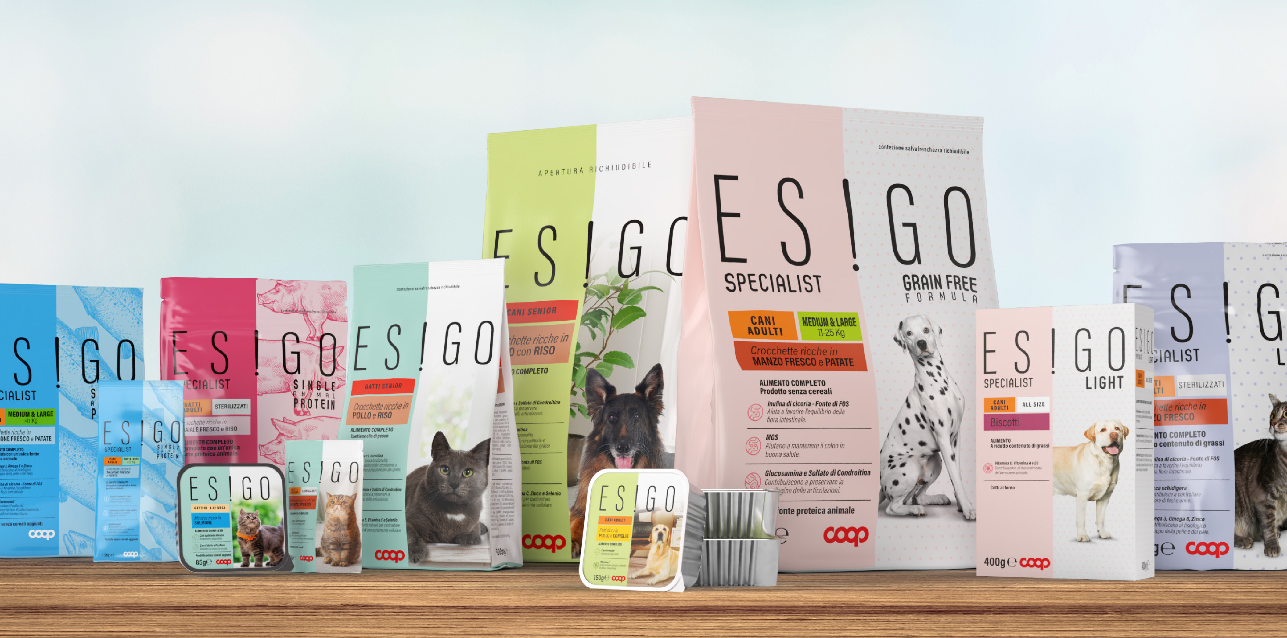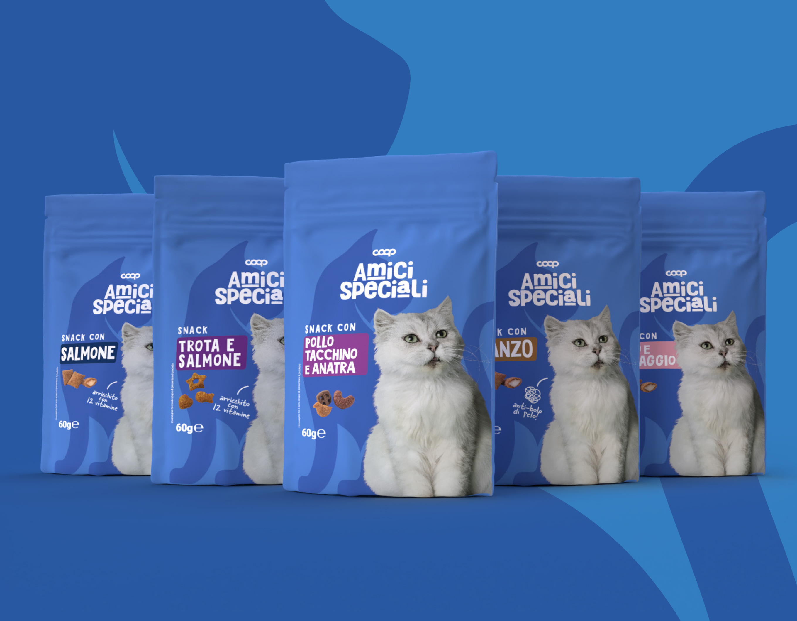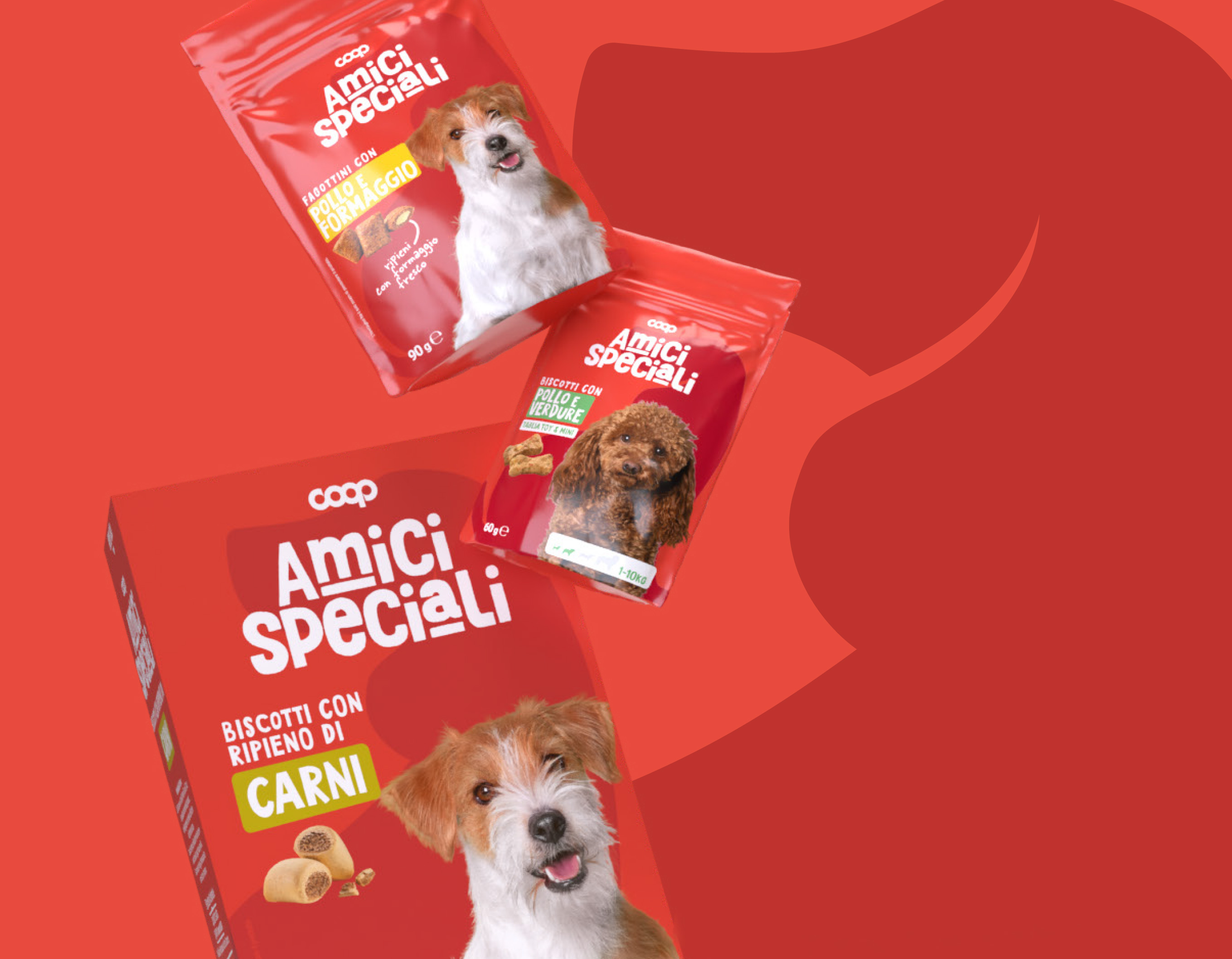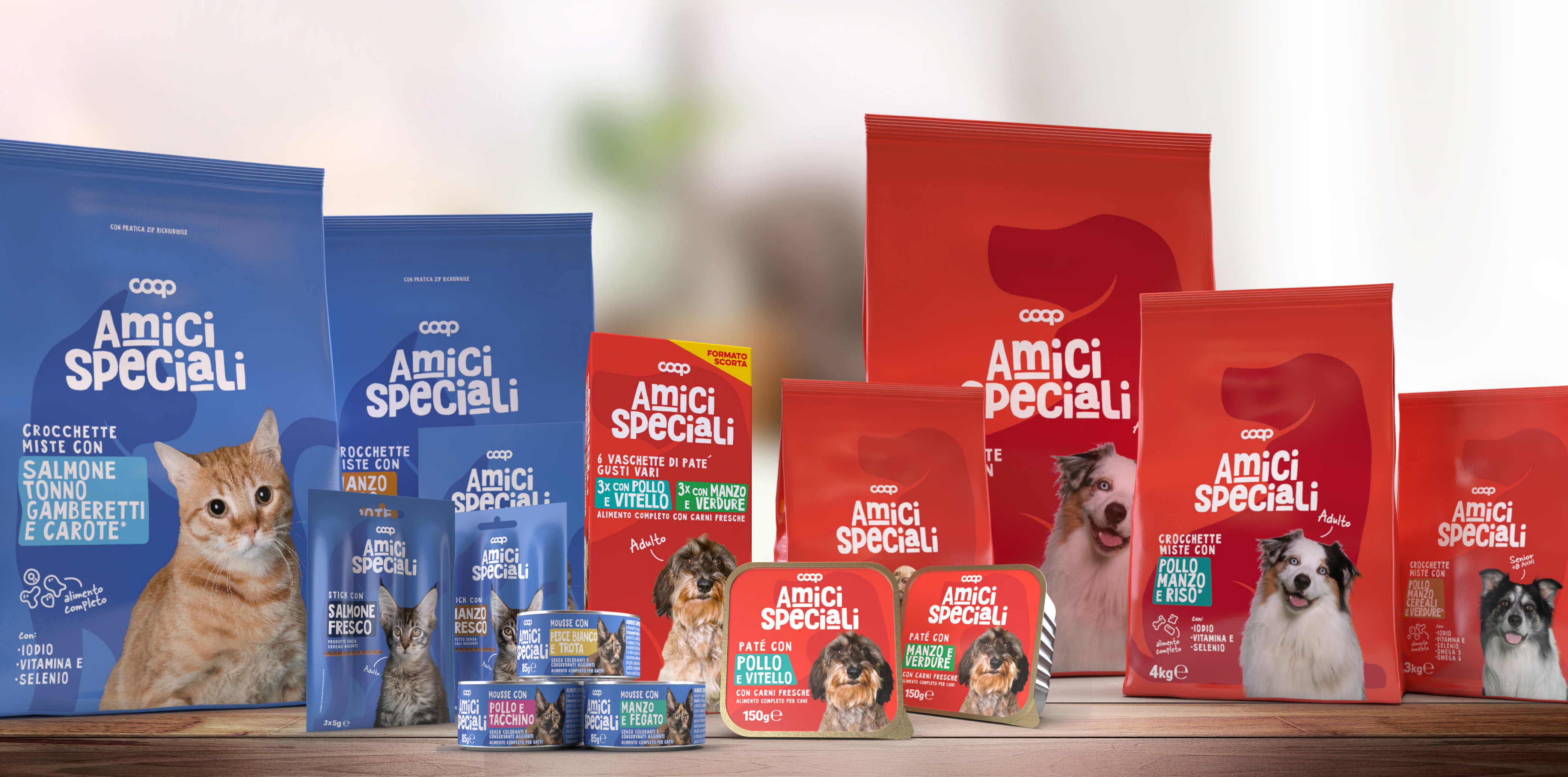 – Amici Speciali. Secco, umido, snack, ma anche accessori e toiletries. È la linea più semplice, per chi cerca una corretta alimentazione quotidiana al giusto rapporto qualità-prezzo, garantito dai valori Coop. E semplici sono il nome e l’identità visiva, che vede il pet in primo piano su uno sfondo lineare.