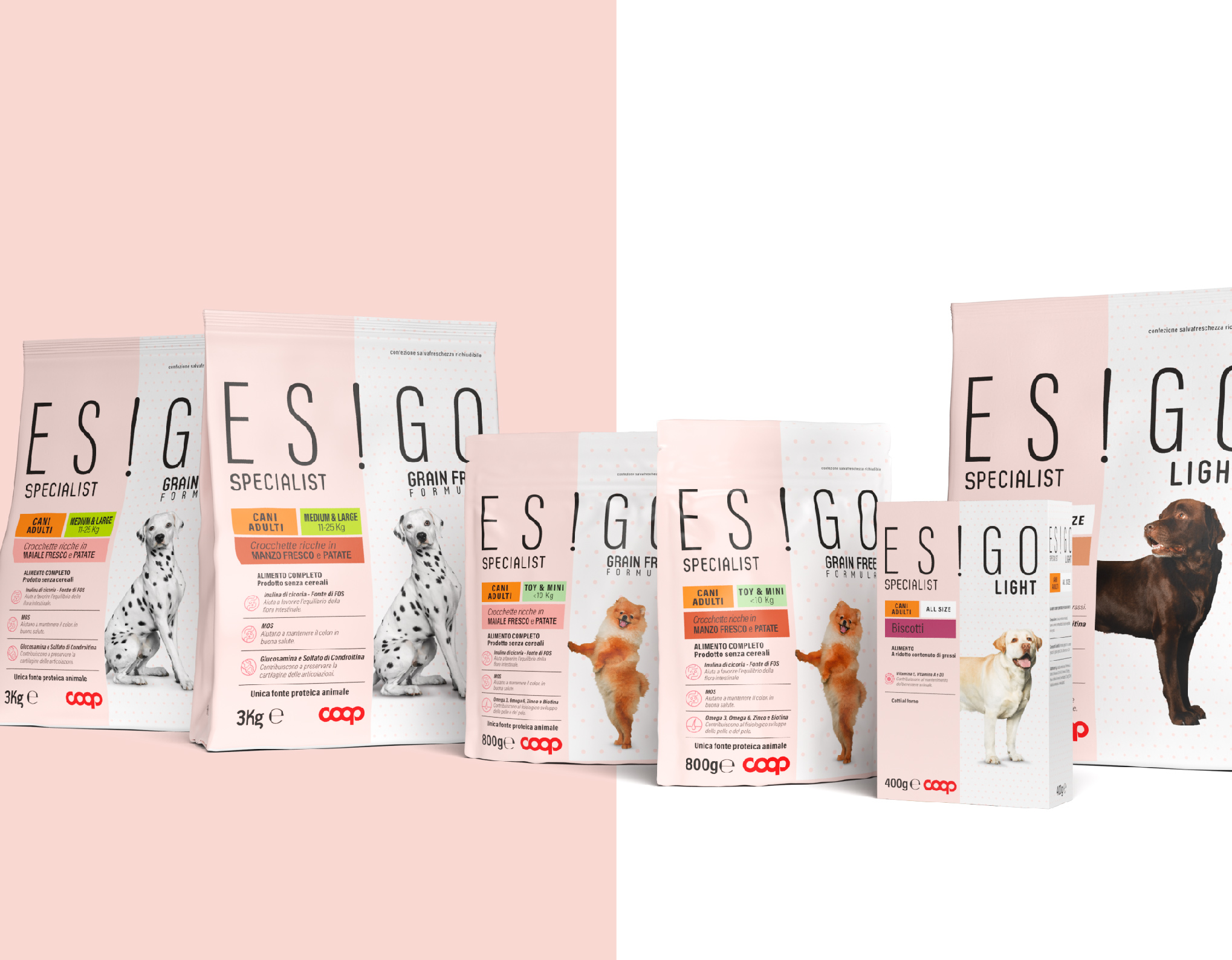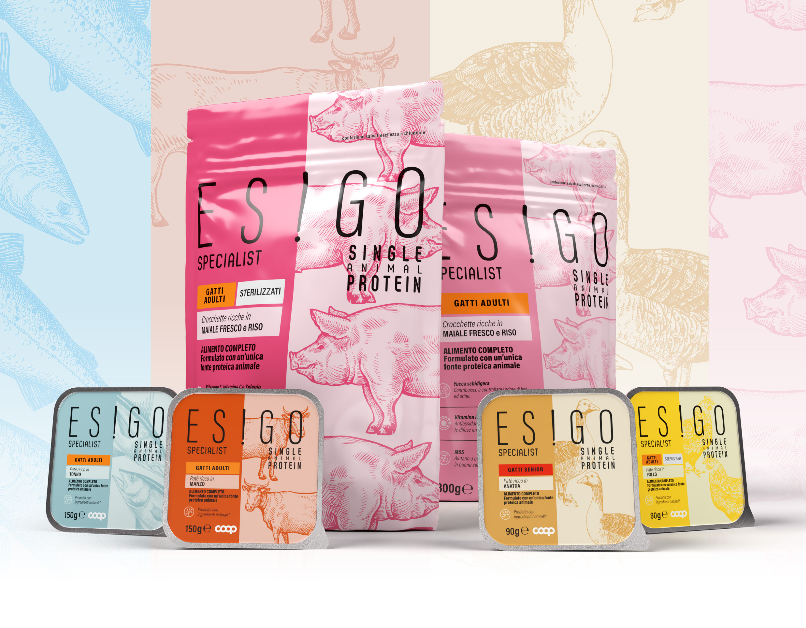Il design è caratterizzato dal rigore scientifico, con un system che divide in due il packaging: le informazioni verbali a sinistra sono affiancate a destra da immagini esplicative (scattate ad-hoc) per indicare razza, taglia, età, etc.. In Esigo Specialist Single Animal Protein invece, la proteina animale diventa l’elemento principale della comunicazione, con illustrazioni che ne sottolineano l’origine.