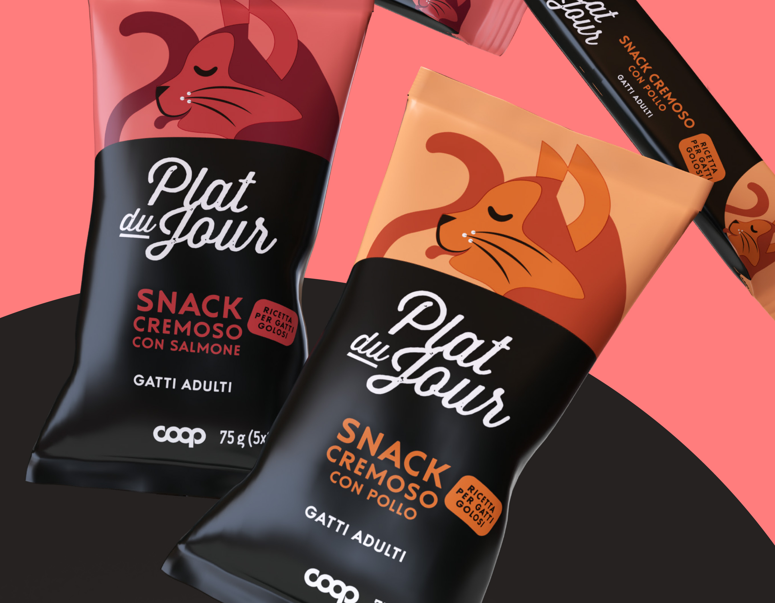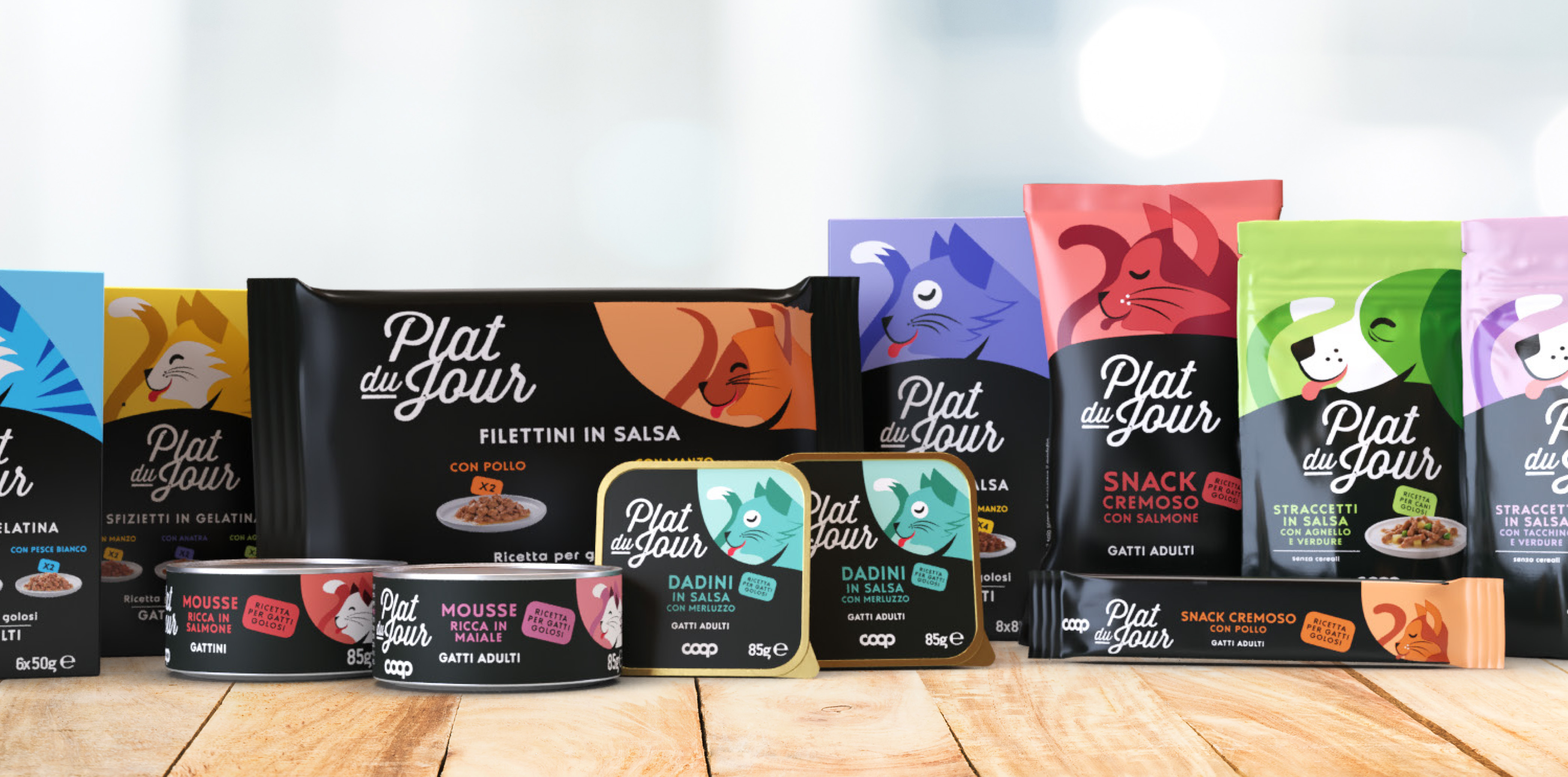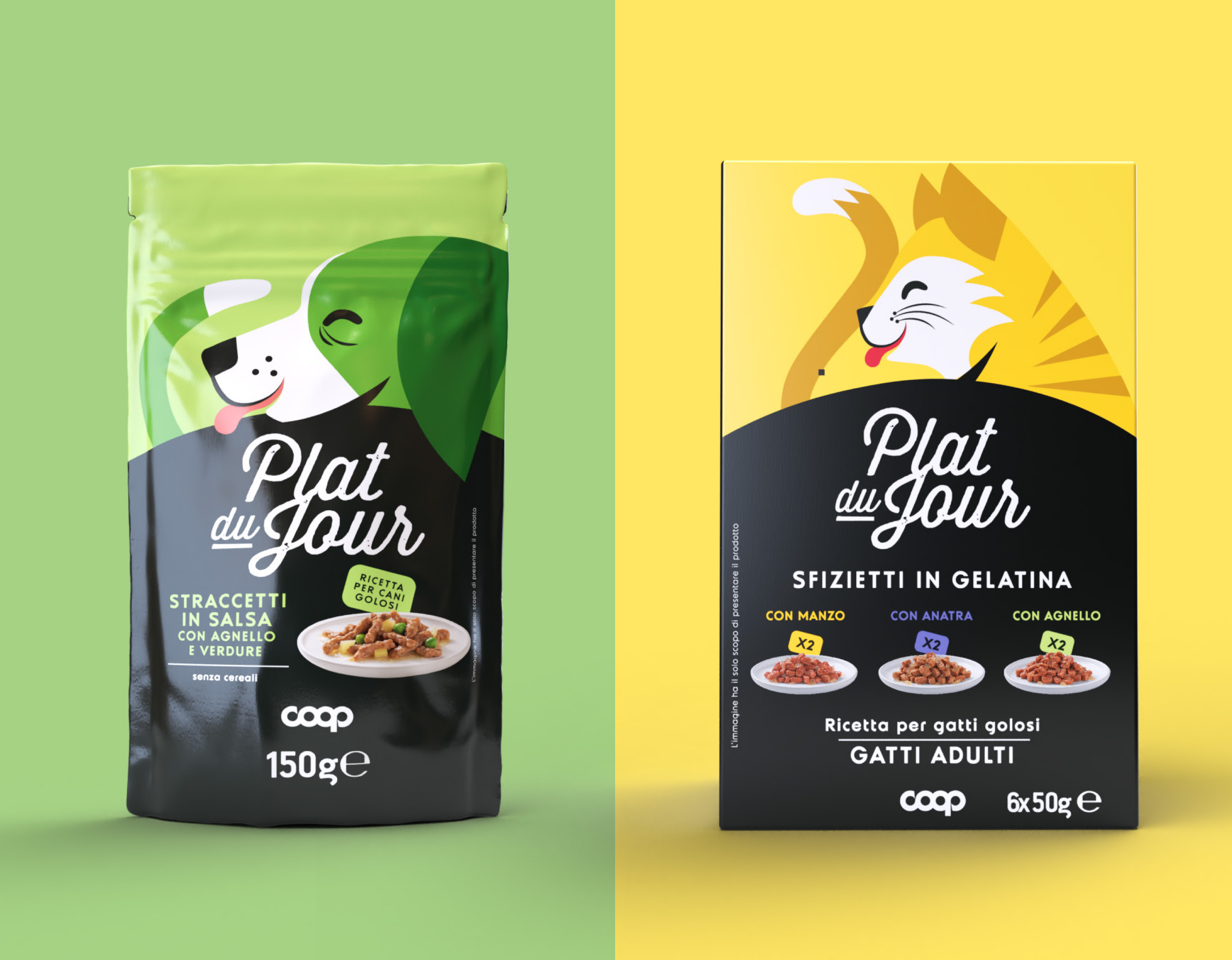 – Plat du jour. È la linea gourmet, la più ricercata. Si rivolge ai proprietari che vogliono stimolare l’appetito dei cani e gatti più esigenti. Qui tutto suggerisce raffinatezza, dal nome francese, alle illustrazioni realizzate ad hoc (diverse per ciascuna tipologia di prodotto), dallo sfondo nero alle immagini del cibo impiattato, pronto a essere servito!