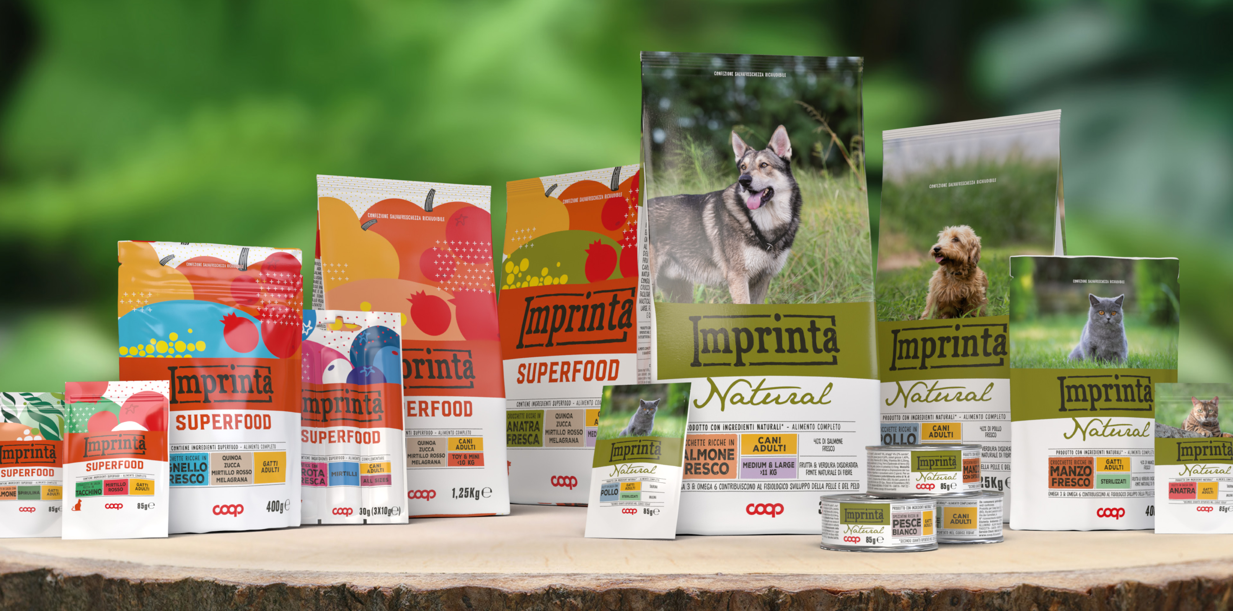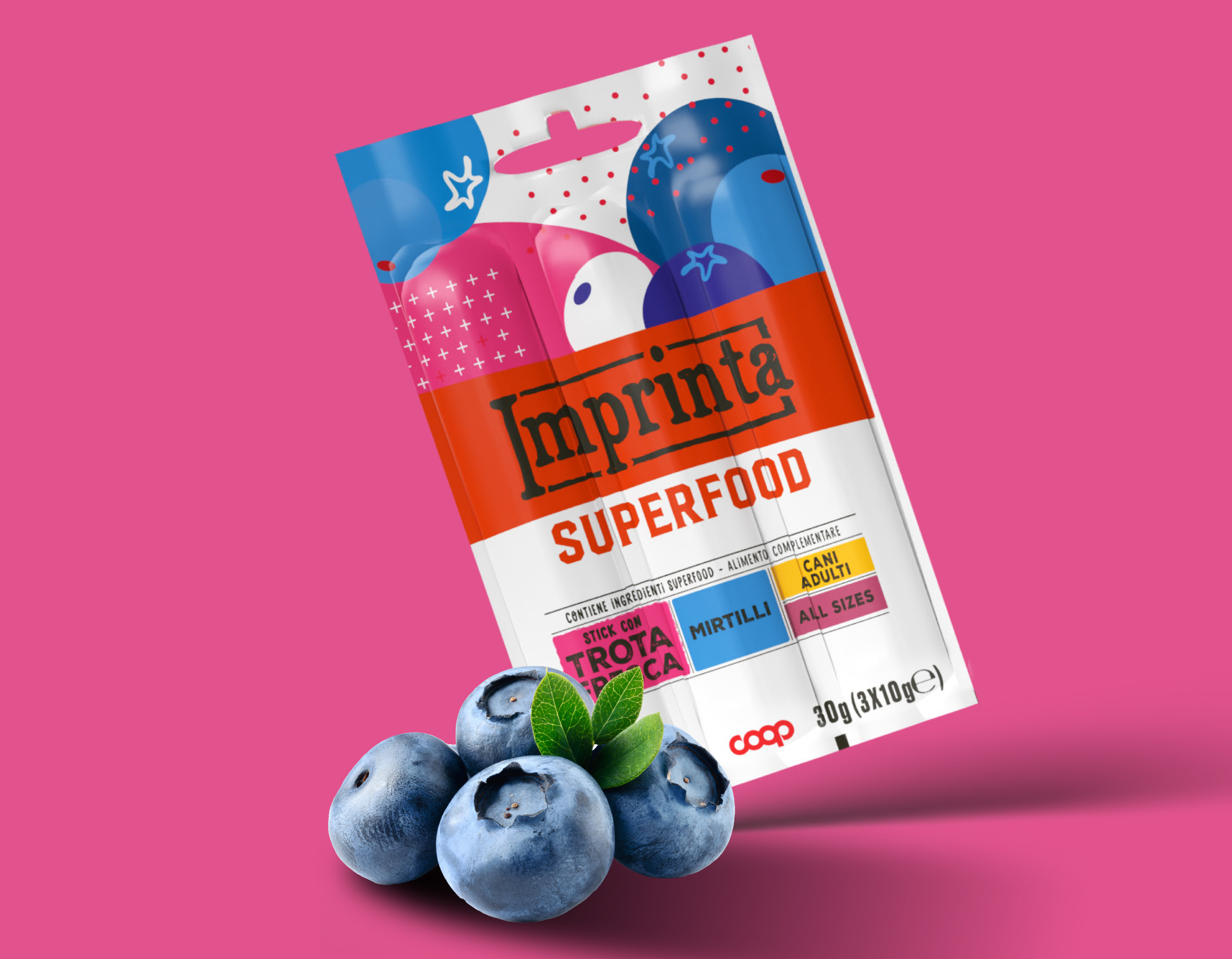 In Imprinta Superfood il visual del pet è sostituito da quello, appunto, dei superfood, protagonisti indiscussi del pack e del benessere dell’animale.