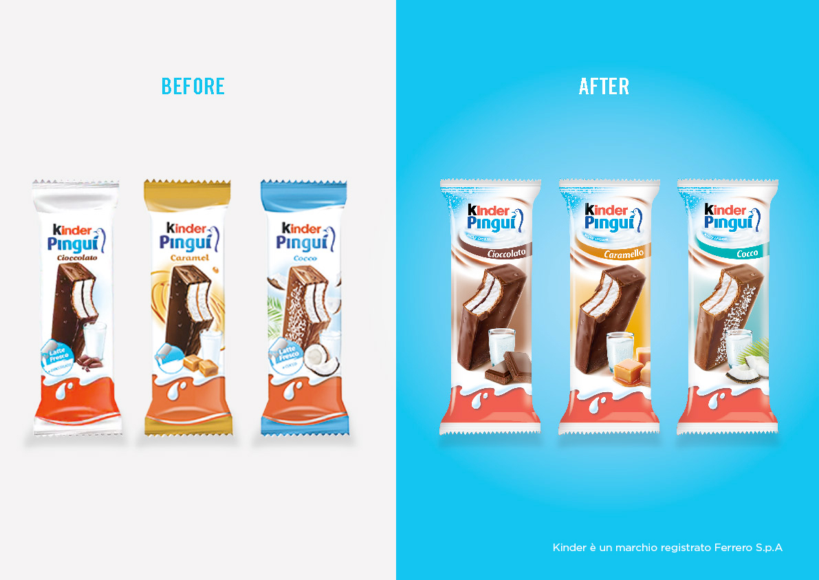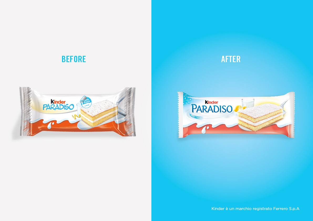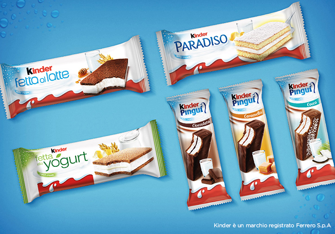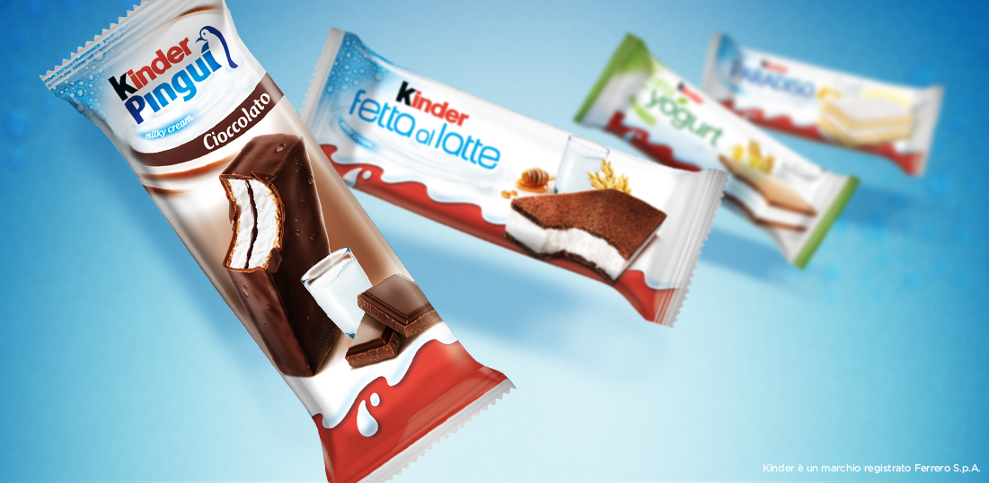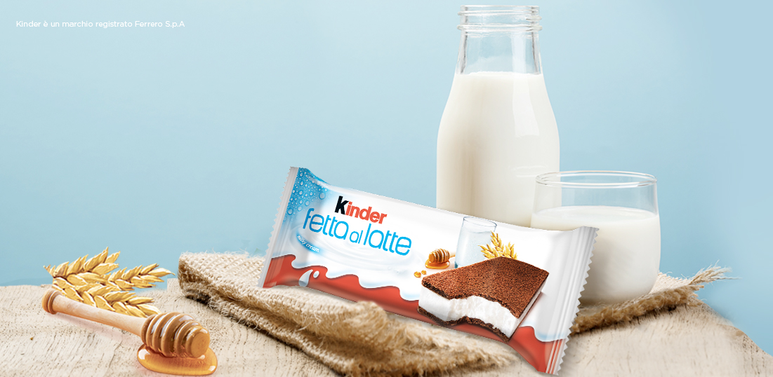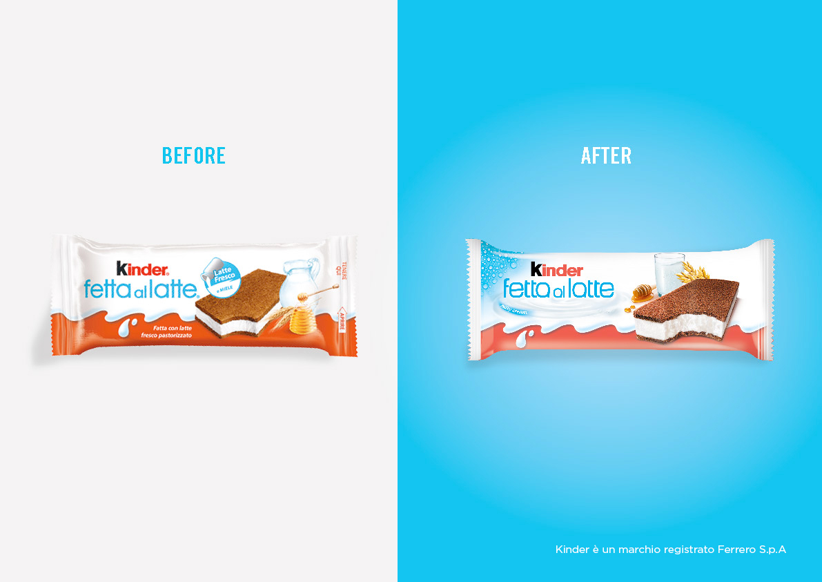 – La colata di latte, forte identificatore di marca, è stata ridotta all’area del brand per consentire al nuovo snack di rivolgersi a un pubblico diverso da quello abituale Kinder.