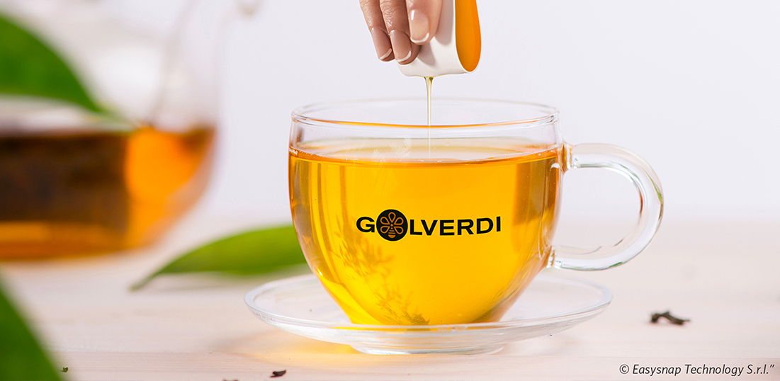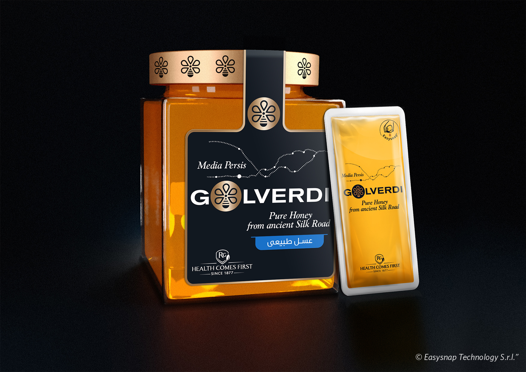 Golverdi, da Farsi “Dono di un fiore”, vuole considerare il nostro miele come un dono della Natura. Il design è moderno, premium e puro con un simbolo iconico che nasce dall’unione di un’ape e un fiore. Il carattere scelto riguarda lo scopo di creare un look & feel moderno. Un chiaro riferimento alla terra di origine del miele è nella mappa della via della seta e nel payoff “Miele puro da antica strada del suolo”. Il packaging mira a trasmettere il messaggio di purezza del prodotto, attraverso la sua trasparenza. Un’attenzione particolare deve essere posta sul packaging: è stata fatta una ricerca approfondita per mettere sul mercato un prodotto tradizionale, su un packaging molto innovativo, con un brevetto sulla tecnologia di Easysnap, che trasmetta un valore aggiunto al prodotto. Infine, su ogni confezione è presente un codice QR, che collega il consumatore ad una pagina internet diretta che permette di risalire al prodotto e alla sua provenienza.