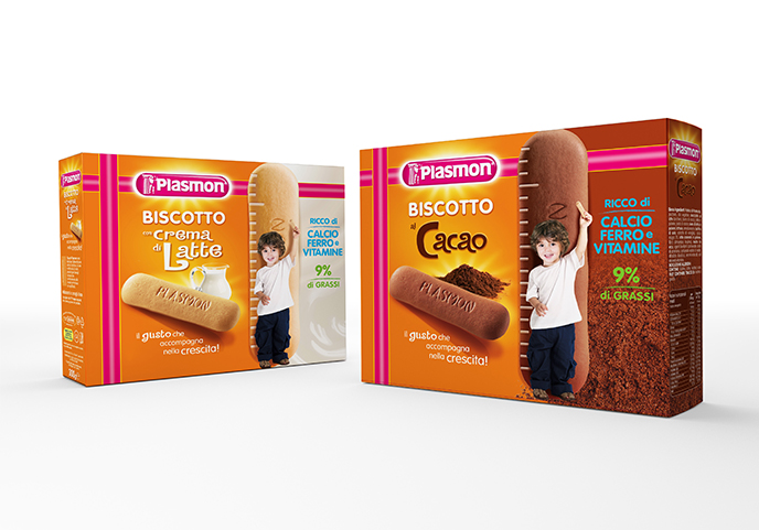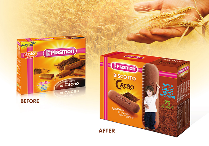 Il pack è stato diviso in due: da un lato la parte più infantile, con i colori di Plasmon e un lettering morbido, dall’altro la parte informativa, con le caratteristiche di gusto, nutrizionali e di supporto alla crescita. L’ampio spazio dato a questa sezione risponde all’esigenza di ridurre la parte visiva con i codici istituzionali, sottolineando così le novità rispetto allo storico biscotto Plasmon per la primissima infanzia.